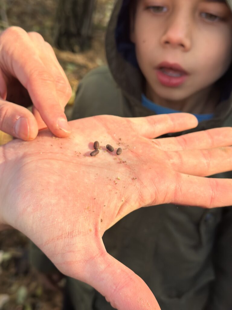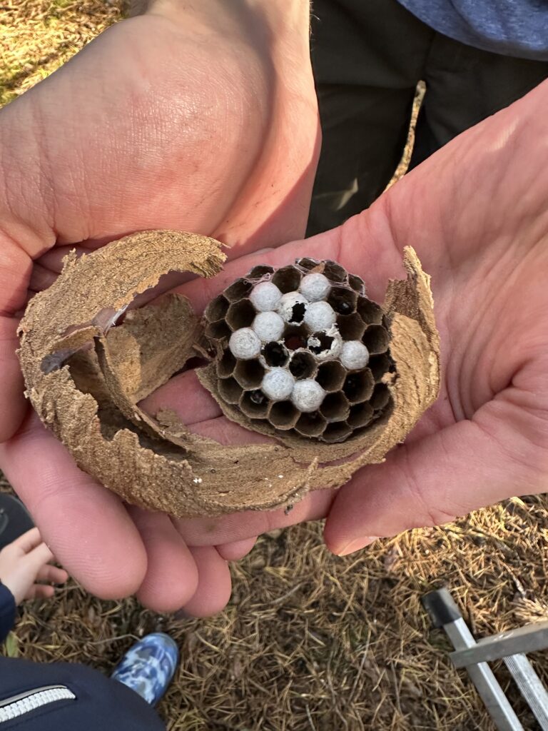 W budce numer 4 czekała na nas niespodzianka – znajdowało się w niej gniazdo, ale z pewnością nie ptasie. Jego mieszkańcami w sezonie letnim były… szerszenie. Mieliśmy więc okazję dokładnego przyjrzenia się misternej konstrukcji gniazda tych dużych owadów, a także ich larwom – gdyż nie wszystkim udało się przepoczwarzyć w dorosłe osobniki. Po wyprowadzce szerszeni z „tekturowego” domku korzystał jeszcze pająk, na co wskazywały resztki znajdującego się między ściankami kokonu.