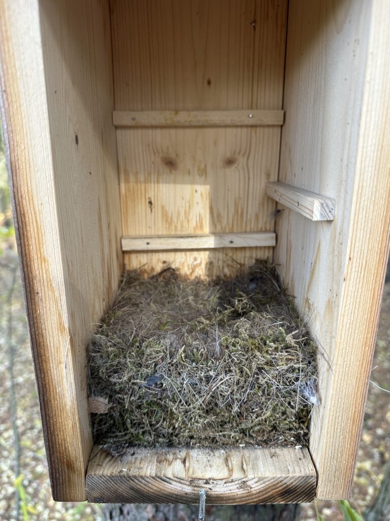 O godzinie 11, po krótkim wprowadzeniu, ruszyliśmy w las. Inwentaryzację połączoną z akcją sprzątania rozpoczęliśmy od skrzynek powstałych podczas warsztatów, które odbyły się w kwietniu ubiegłego roku. Pierwsze trzy wille skrywały jedynie drobne kawałki mchu wskazujące, że potencjalni lokatorzy się owszem pojawili, ale z jakiegoś powodu nie dokończyli budowy gniazd.