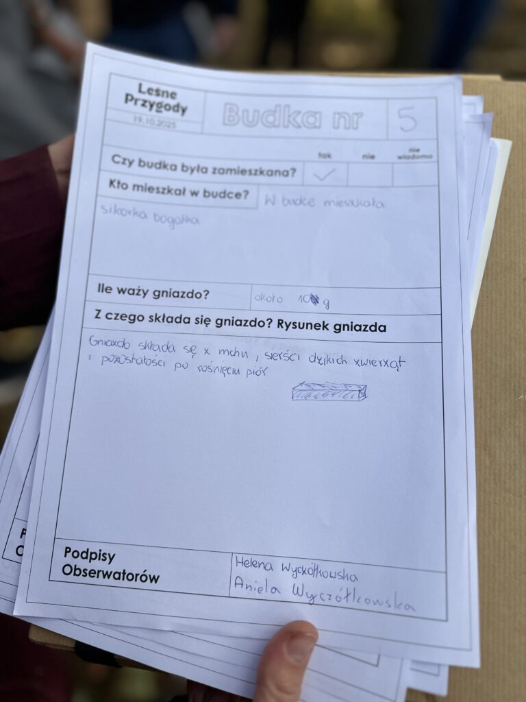 Piątka okazała się dziś szczęśliwa – w budce o tym właśnie numerze znaleźliśmy niewielkie, lecz bardzo eleganckie gniazdo sikory bogatki, składające się z mchu, mięciutkiej wyściółki ze zwierzęcej sierści oraz pozostałości po rurkach, wewnątrz których wykształcały się pióra piskląt.