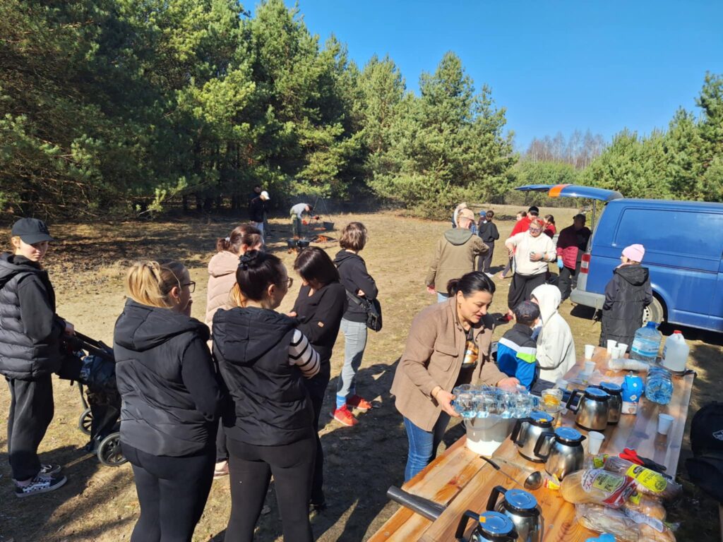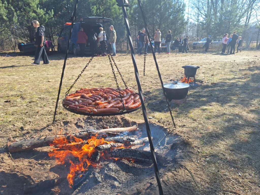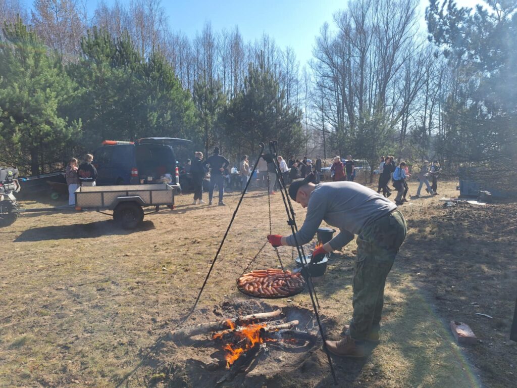 Ale to nie koniec atrakcji. Nasi gospodarze – mieszkańcy Tułu i Karolewa – przygotowali dla strudzonych wolontariuszy przepyszny poczęstunek. Po zakończonym sprzątaniu można było posilić się pieczoną na ruszcie nad ogniskiem kiełbaską, w kociołkach grzały się rosół, grochówka oraz bigos, a na deser czekały ciasta i ciasteczka.
