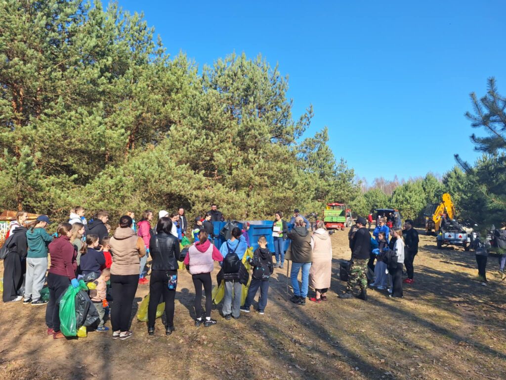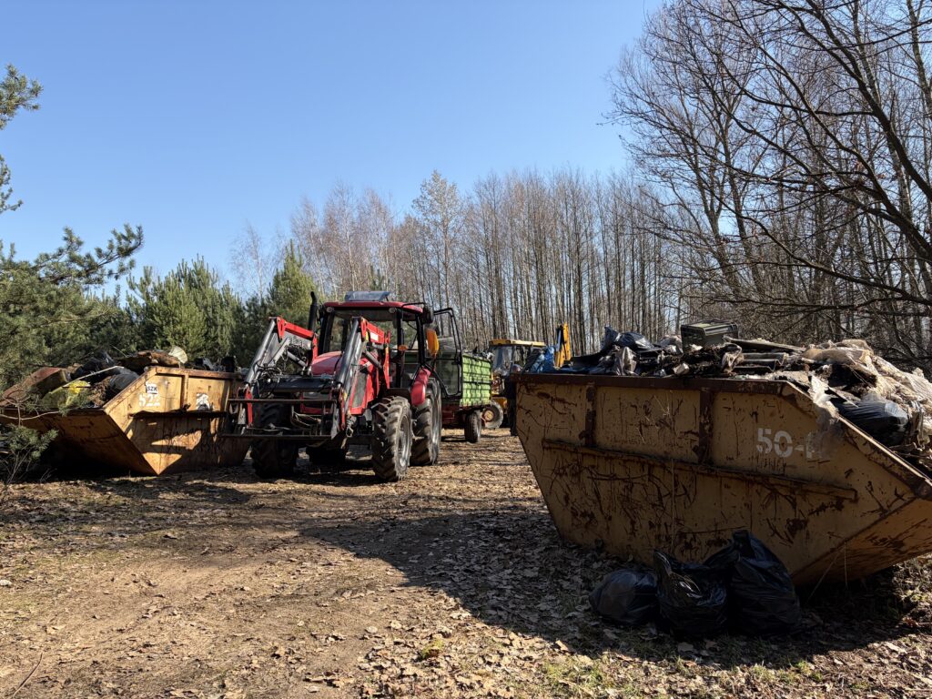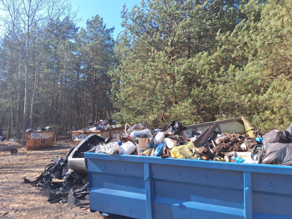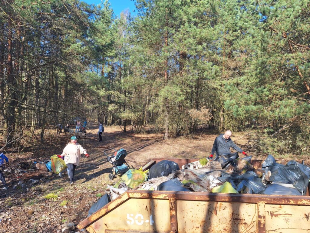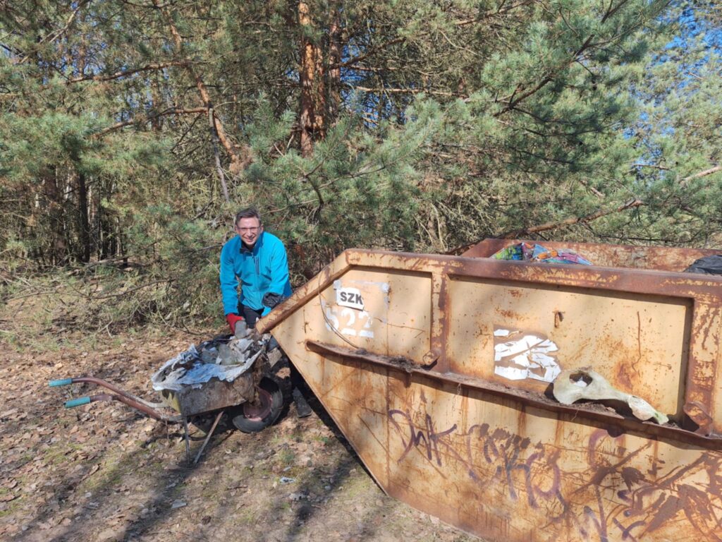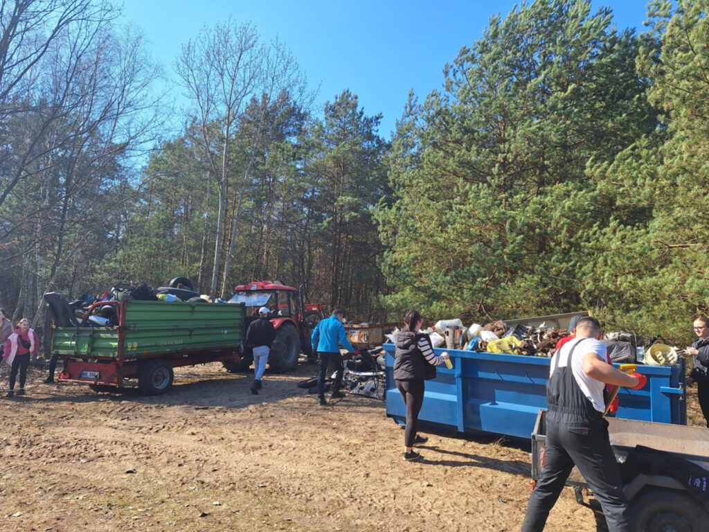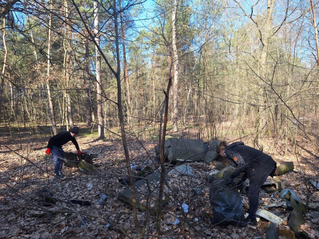A było to nie lada wyzwanie – począwszy od wielkiej góry śmieci na skraju lasu, po mniejsze składowiska w dalszej jego części. I chociaż na pierwszy rzut oka ilość zalegających odpadów wydawała się nie do ogarnięcia, to – podobnie jak miało to miejsce jesienią w Kruszu – mieliśmy okazję przekonać się, że w grupie można zdziałać cuda. Kontenery w mig zostały zapełnione, a las odzyskał swoją naturalną urodę.